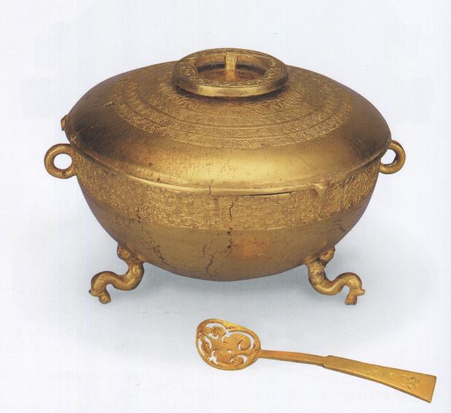 图四 随州曾侯乙墓出土金盏和镂空金匕(方勤、万全文:《绽放荆楚 传承文明——湖北省博物馆》,湖北科学技术出版社,2021年,第164页)