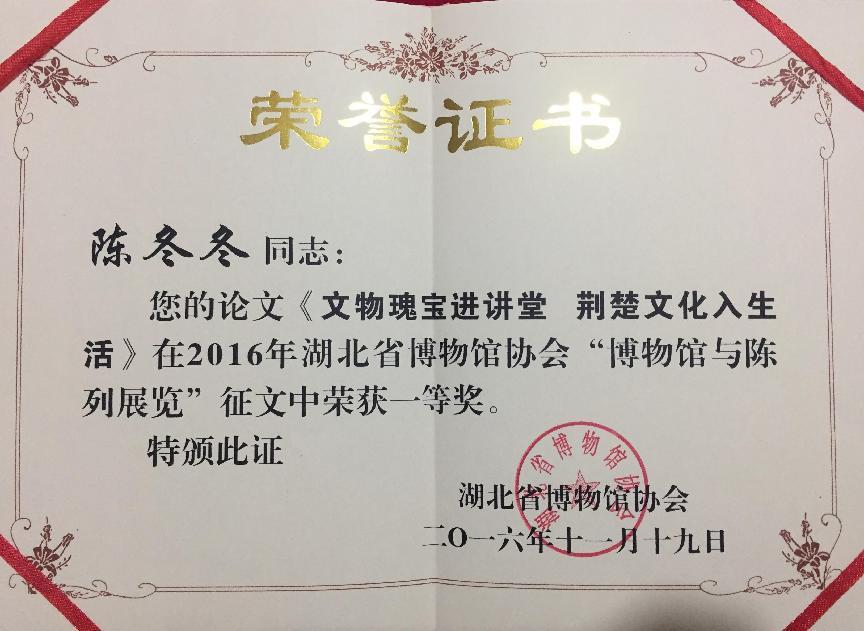 陈冬冬《文物瑰宝进讲堂 荆楚文化入生活——荆州博物馆举办“荆楚瑰宝趣味讲堂”的成效和经验》荣获湖北省博物馆协会征文一等奖