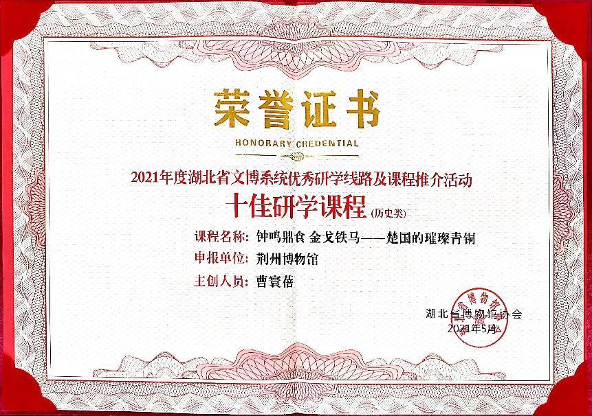 陈冬冬《文物瑰宝进讲堂 荆楚文化入生活——荆州博物馆举办“荆楚瑰宝趣味讲堂”的成效和经验》荣获湖北省博物馆协会征文一等奖