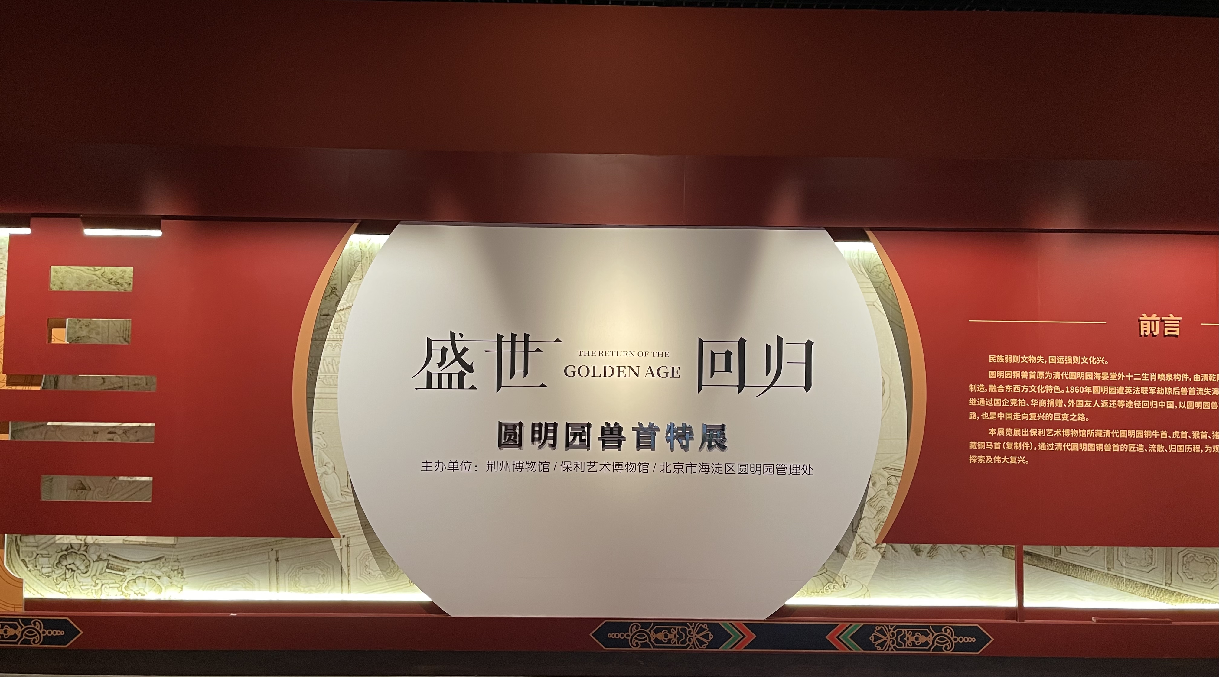 2023年3月14日,由荆州博物馆携手保利艺术博物馆、北京市海淀区圆明园管理处共同打造“盛世回归——圆明园兽首特展”在荆州博物馆临时展厅正式开展。本展览展出保利艺术博物馆所藏清代圆明园铜牛首、虎首、猴首、猪首及北京市海淀区圆明园管理处所藏铜马首(复制件),通过清代圆明园铜兽首的匠造、流散、归国历程,为观众展现中华民族历经的苦难、抗争、探索及伟大复兴。展览将展至2023年4月9日。
