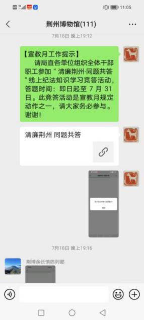 (六)组织参加“清廉荆州·同题共答”和观看“清风颂”廉政书画展。7月18日组织全体干部职工参加“清廉荆州.同题共答”线上纪法知识学习竞答活动;24日组织全体干部职工线上观看省直机关第九届“清风颂”廉政书画作品展,组织营造学法、知法、守法的良好氛围。