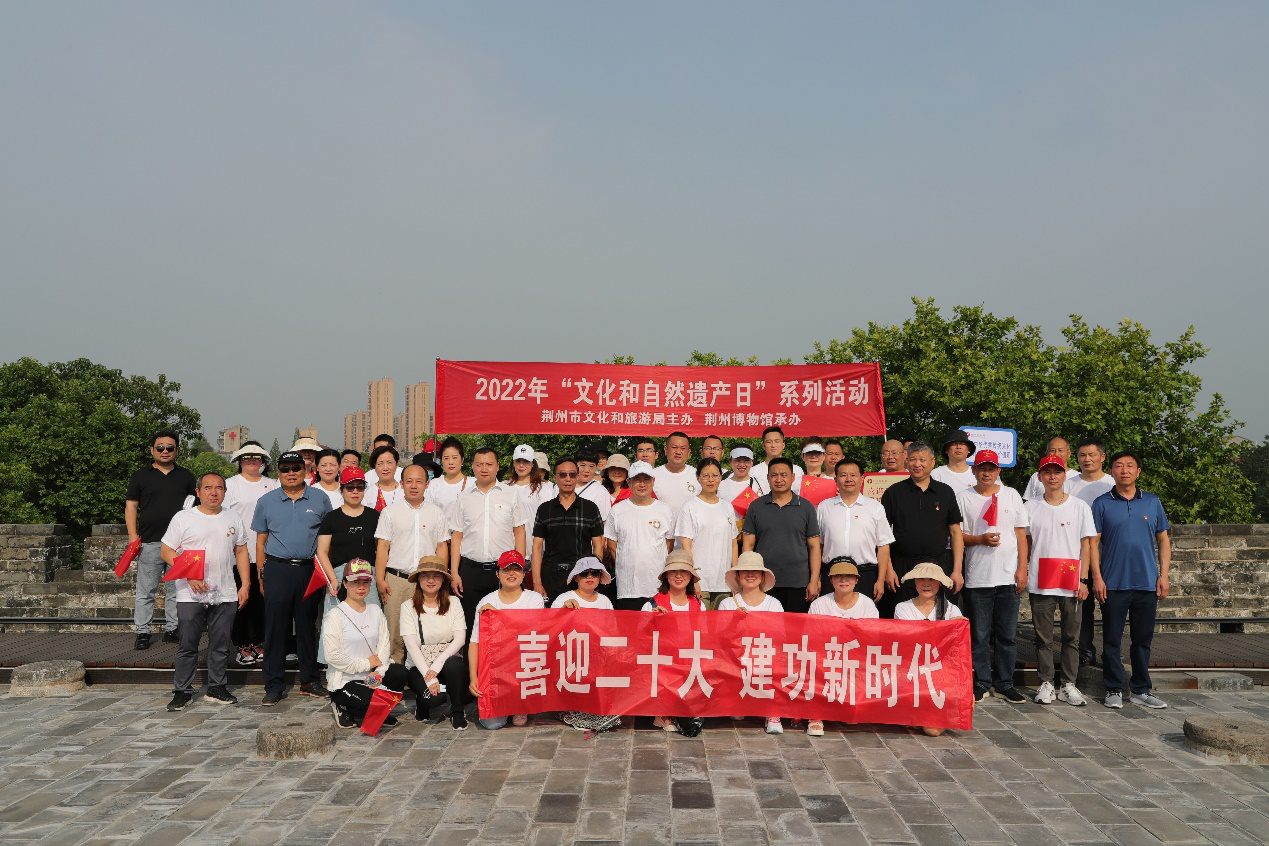 2022年6月11日是我国第十七个“文化和自然遗产日”,主题是 “文物保护:时代共进,人民共享”。上午八点半,荆州市文化和旅游局主办、荆州博物馆承办“游荆州古城 品荆风楚韵”文化自然之旅在荆州城墙西门(安澜门)启动,荆州市文化和旅游局党组成员、副局长王立静,荆州博物馆党委书记郑雷致辞,市文旅局、市文旅投、荆旅集团、荆州文物保护中心、荆州市万寿宝塔管理中心、荆州区文旅局、沙市区文旅局等文旅系统单位以及文博志愿者、媒体代表、市民朋友等参加活动。