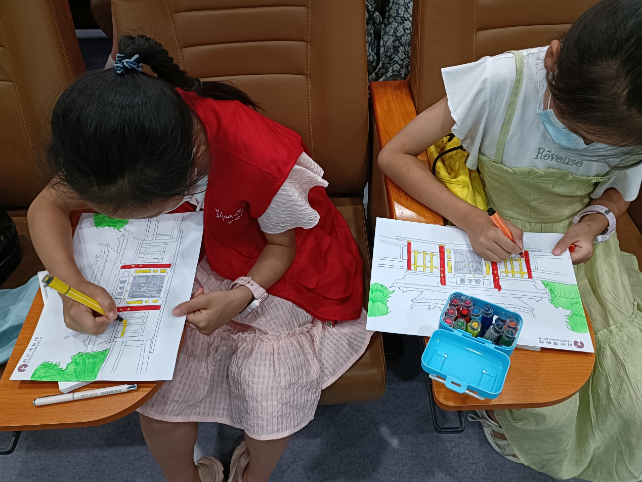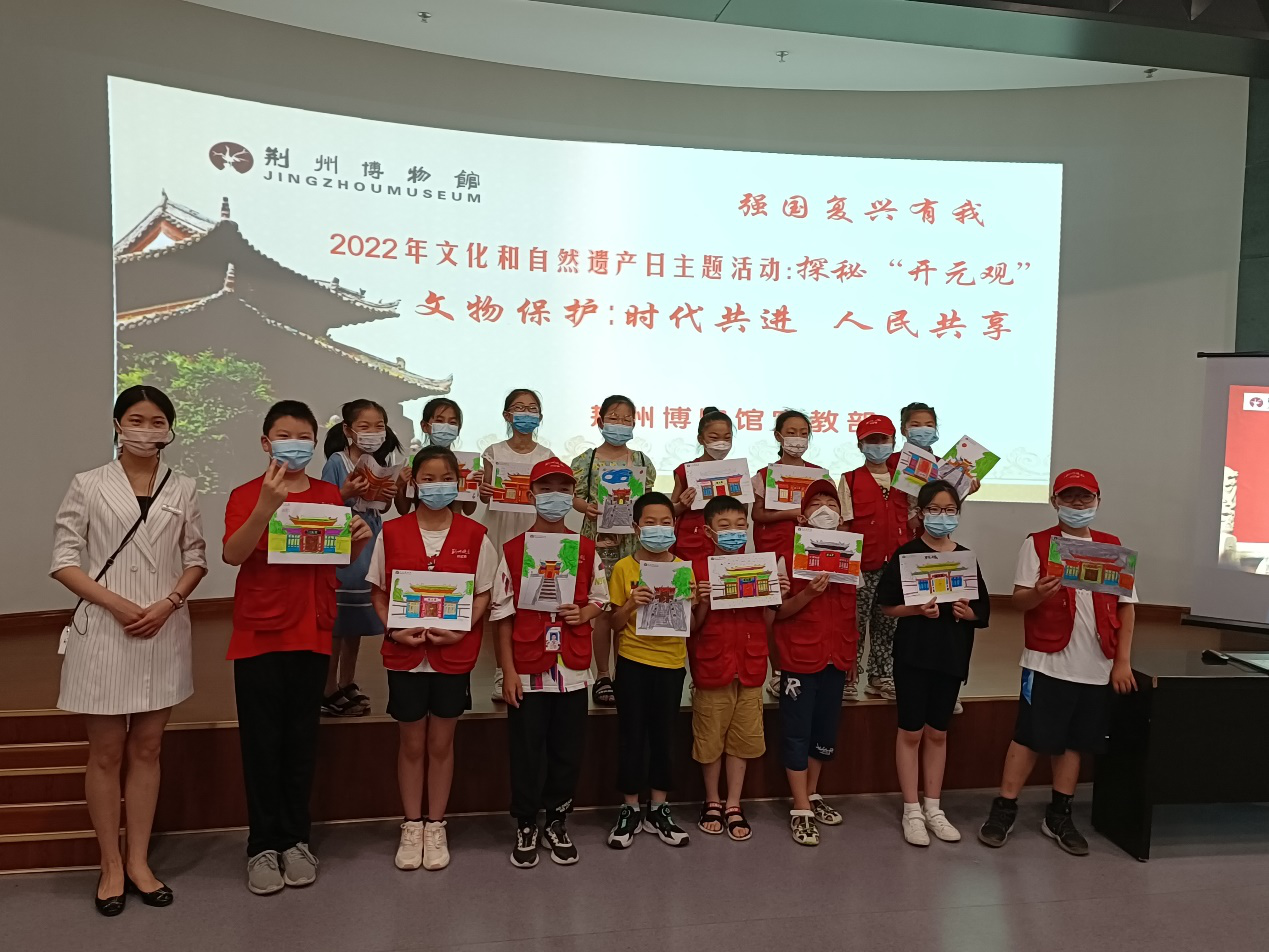 与此同时,荆州博物馆内开展了《荆楚瑰宝趣味讲堂》之《探秘开元观》活动,宣教部组织青少年通过参观身边的珍贵历史文化遗产、全国重点文物保护单位——开元观,了解文化和自然遗产价值,享受文化和自然遗产保护成果,从小建立爱护文物、保护文物的思想,同时学习家乡历史,增强文化自信。讲解员熊静怡在珍品馆电教厅为青少年儿童讲述中国古建筑的屋顶、屋檐、斗拱等知识,让大家深入了解古代建筑特点、构件功能、匠心设计等,还开展互动问答、趣味手工,进一步感受中国古建筑的魅力。