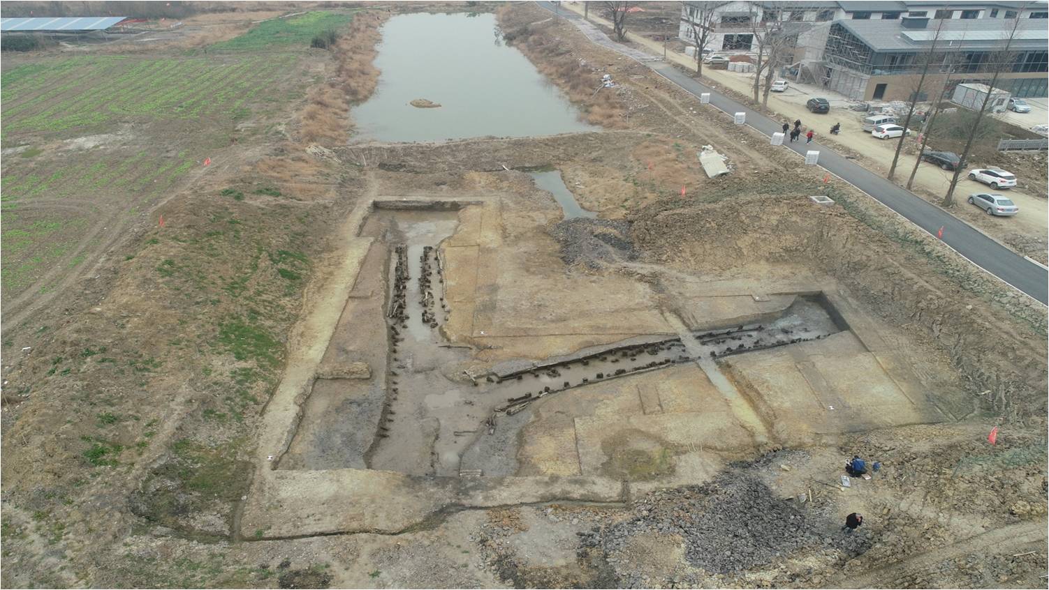 2019年,在郢城遗址东城门及护城河的考古发掘中,荆州博物馆考古队在正对郢城东门的护城河中发现一座木构桥梁;2020年7月,在配合郢城遗址本体保护修缮一期工程的考古发掘中,考古队在郢城遗址内南、北水系中部发现两座木构桥梁及部分圆木护岸桩,三座木构桥梁在空间上处在同一直线上。2021年4月,考古队在南、北水系与南城垣交汇处发现一处大型木构遗存,该发现与“南、北水系”中部两座秦汉木桥处于同一河道中,同属郢城始建及使用时期木结构遗存,但用途完全不同。