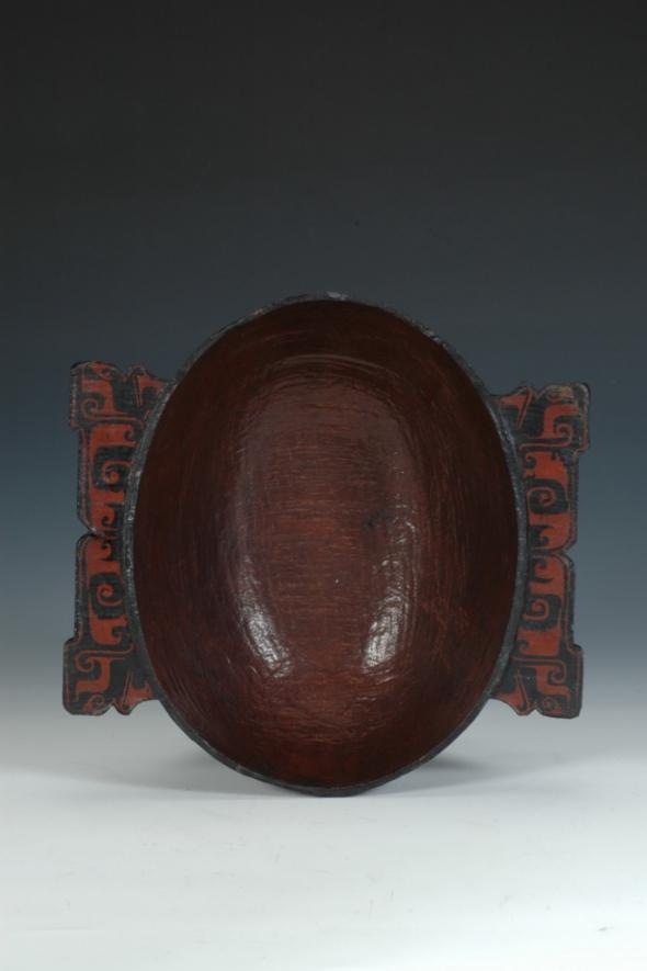 展厅的这件耳杯口长24.4厘米,容积约1600毫升,属于超大型耳杯,不太适宜作为直接奉饮的酒具,可能是作为盛放羹汤、的食器使用。