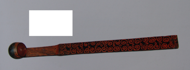 荆州博物馆珍品馆漆木器展厅展出有两种漆勺。一种是长柄漆勺(图二),出土于荆州天星观1号楚墓。整木斫制成,勺首作扁圆形,长方形柄。勺内髹红漆,外髹黑漆并用红漆彩绘纹饰。勺首口沿外侧朱绘一周绹纹,柄正面朱绘三角形雷纹、卷云纹。长92.5、宽7.5、高7.5、勺深2.5厘米。长柄勺的柄比较长,适合从器体比较高的盛酒具如缶、壶、钫中取酒。类似的长柄漆勺在荆州望山1号楚墓、包山2号楚墓、信阳1、2号楚墓、枣阳九连墩2号楚墓等贵族墓葬中也有出土,一般长45—75厘米左右,荆州博物馆展出的这件是目前楚墓已出土的漆勺中最长的一件。