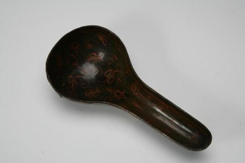 荆州博物馆珍品馆漆木器展厅展出有两种漆勺。一种是长柄漆勺(图二),出土于荆州天星观1号楚墓。整木斫制成,勺首作扁圆形,长方形柄。勺内髹红漆,外髹黑漆并用红漆彩绘纹饰。勺首口沿外侧朱绘一周绹纹,柄正面朱绘三角形雷纹、卷云纹。长92.5、宽7.5、高7.5、勺深2.5厘米。长柄勺的柄比较长,适合从器体比较高的盛酒具如缶、壶、钫中取酒。类似的长柄漆勺在荆州望山1号楚墓、包山2号楚墓、信阳1、2号楚墓、枣阳九连墩2号楚墓等贵族墓葬中也有出土,一般长45—75厘米左右,荆州博物馆展出的这件是目前楚墓已出土的漆勺中最长的一件。