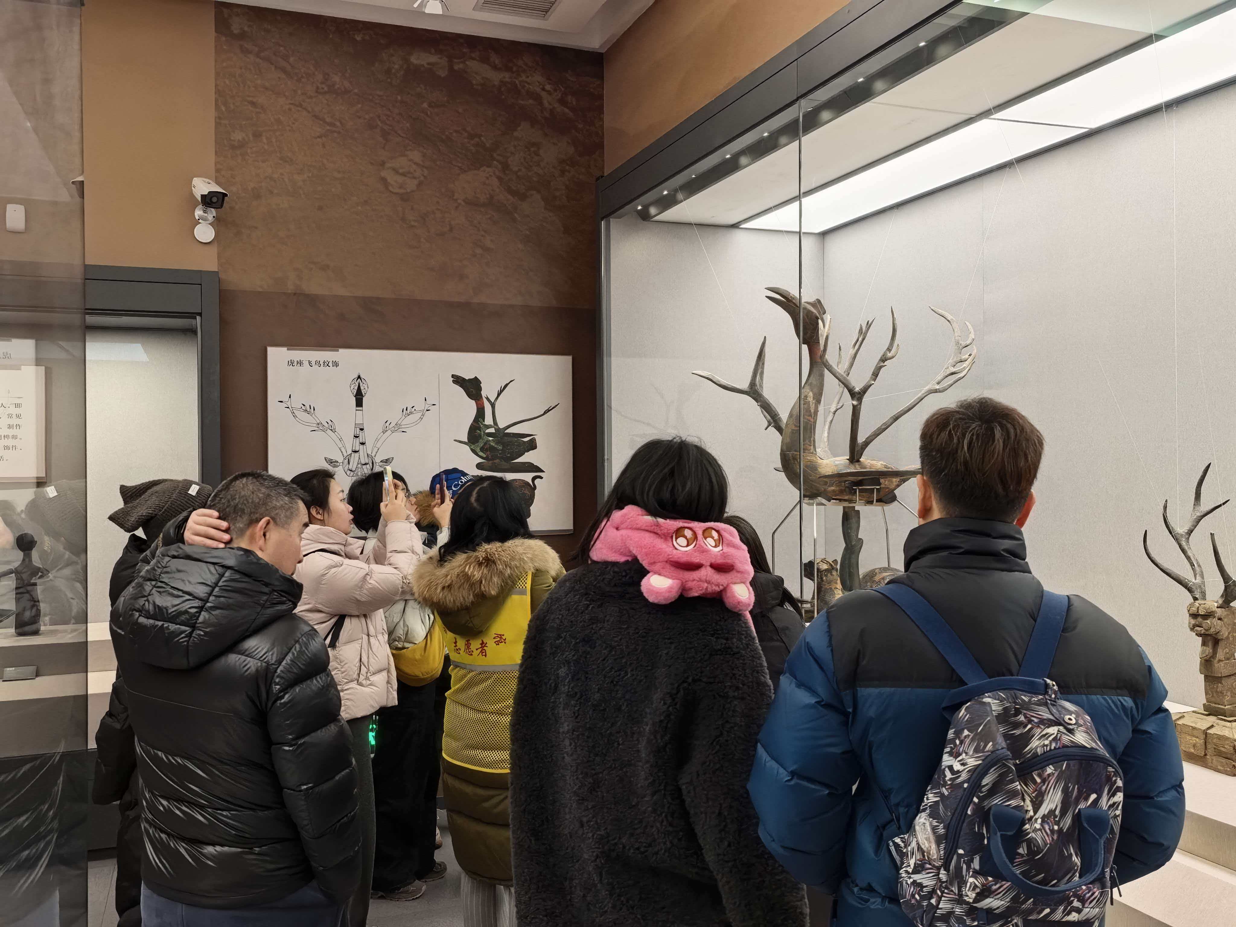 本次活动以文物为媒,深挖馆藏珍品的新年寓意,特别推出新年寻福游览路线。由志愿者阮老师带队,生动讲解承载美好祝愿的文物:三鱼纹耳杯上灵动的鱼纹,谐音“余”,寄托着“年年有余”的富足期盼;造型别致的卧鹿鼓,鹿谐音“禄”,搭配鼓的吉祥意象,暗含“福禄寿”俱全的美好祝愿;镇馆之宝虎座凤鸟悬鼓,凤鸟昂首、虎形稳重,彰显出“龙凤呈祥”的祥瑞之气。将文物历史与新年民俗巧妙结合,让观众在聆听讲解的过程中,领略传统节日的深厚底蕴。