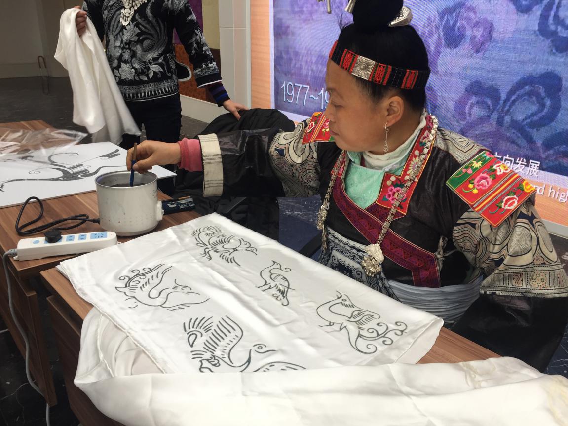 贵州苗寨染娘在苏州丝绸博物馆展览现场展示苗族传统蜡染手工艺