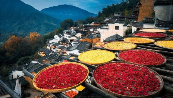 立秋时节,主要在山区的人们,利用房前屋后及窗台屋顶等挂晒农作物,色彩鲜艳,赏心悦目。